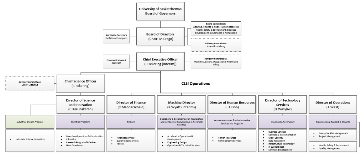 As the sole member of the corporation, the University of Saskatchewan through its Board of Governors appoints the CLS Board of Directors. Accountability to the University of Saskatchewan is maintained through the appointed positions of those occupying the University positions of the Vice President Research, and Vice President Finance and Resources, and through reporting to the University of Saskatchewan, Board of Governors at their Annual General Meeting in June, and through mid-year reports. The reports provided to the Board of Governors include the CLS annual report and annual financial statements, as well as updates on strategic leadership and resource management, governance and management structure, the operational capacity of the facility and stakeholder relations.